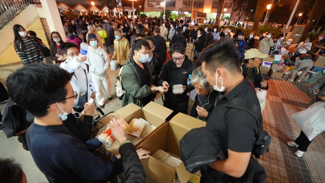 11月27日,义工在宏福苑附近向受火灾影响的市民派发物资。新华社  图