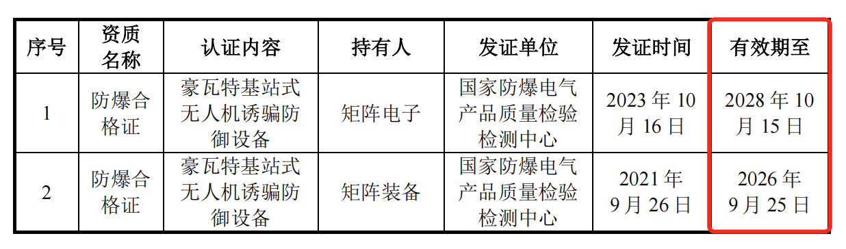 据了解,我国对军品生产实施严格的资质审核和市场准入制度,相关资质需要定期重新认证。从说明书中可以看到,比如北斗院控股子公司矩阵装备持有的“防爆合格证”由国家防爆电气产品质量检验检测中心颁发,发证日期为2021年9月26日,有效期至2026年9月25日。