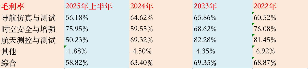 分业务板块观察,航天测控与测试业务毛利率下滑最为显著,从2022年的81.45%骤降至2025年上半年的50.23%。公司解释主要源于毛利率相对较低的卫星测控地检产品销售收入占比提升。而作为收入支柱的导航仿真与测试业务,其毛利率也从2022年的60.52%回落至2025年上半年的56.18%。